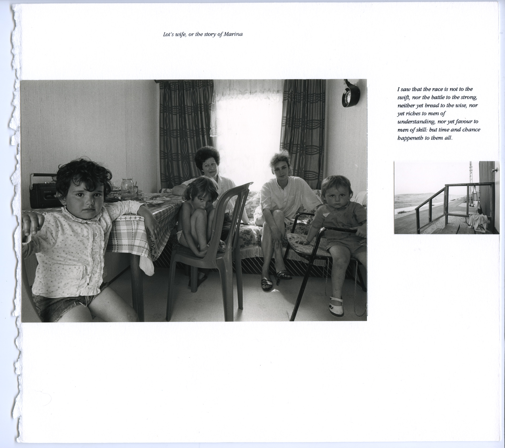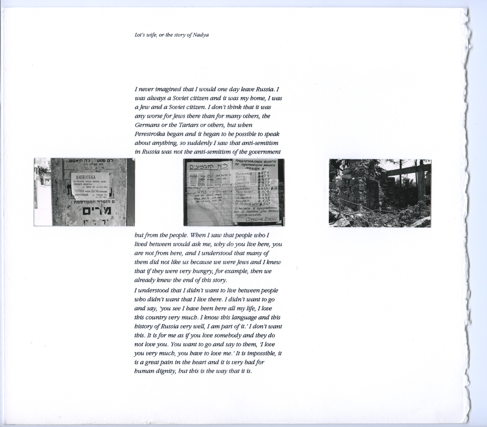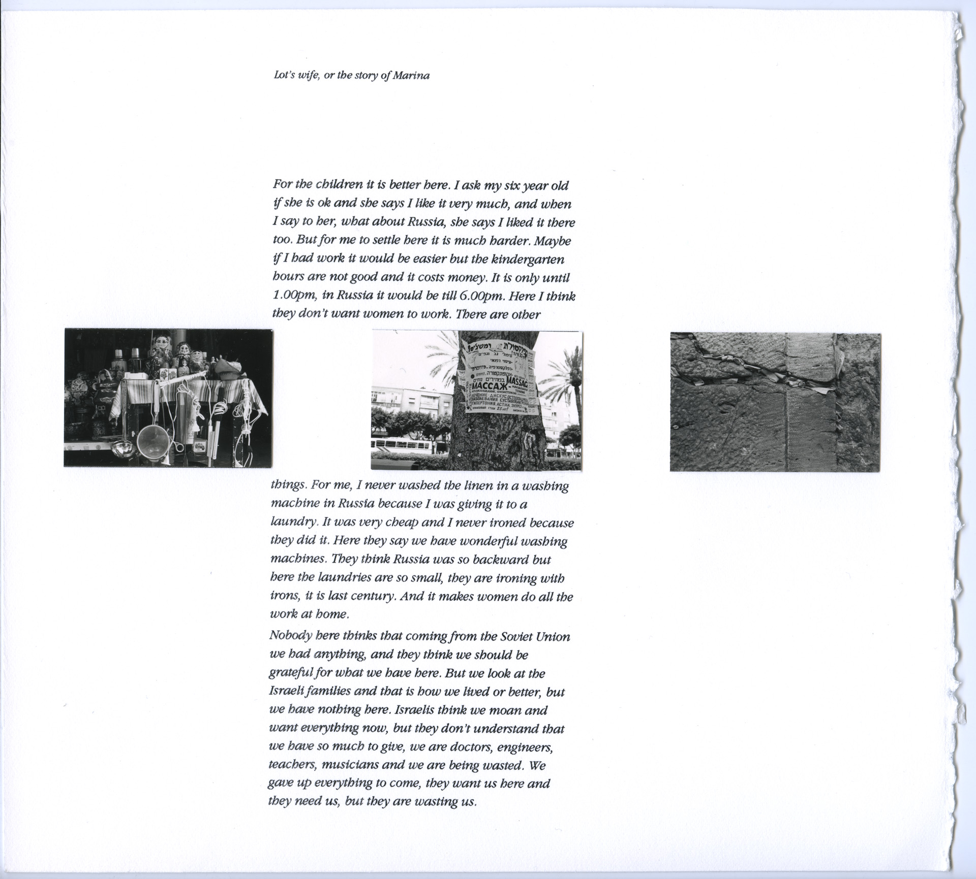 Lot’s Wife was a highly personal project, informed by Franki’s own cultural identity. Her grandparents were Jews who, as a result of persecution, had emigrated to the UK from eastern Europe around the start of the 20th century. She had previously spent several summers in Israel as a teenager. The title for the project is based upon the poem by Anna Akhmatova, a Soviet dissident writer, who reflected on the Old Testament story of how Lot’s wife disobeyed God to turn for a last look at her home as they fled from the city of Sodom and, how, as punishment she had been turned into a pillar of salt. Accompanied by text, and carefully laid out, as can be seen in the draft layouts below, the images in Lot’s Wife were designed to be presented as both an exhibition and in book form.