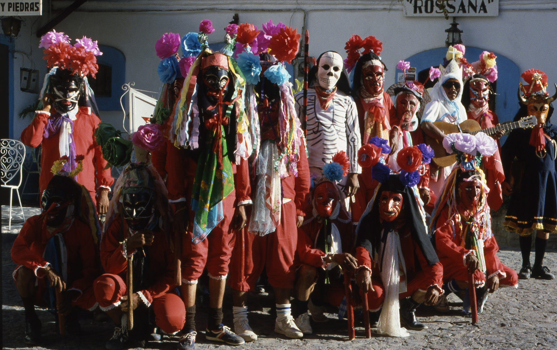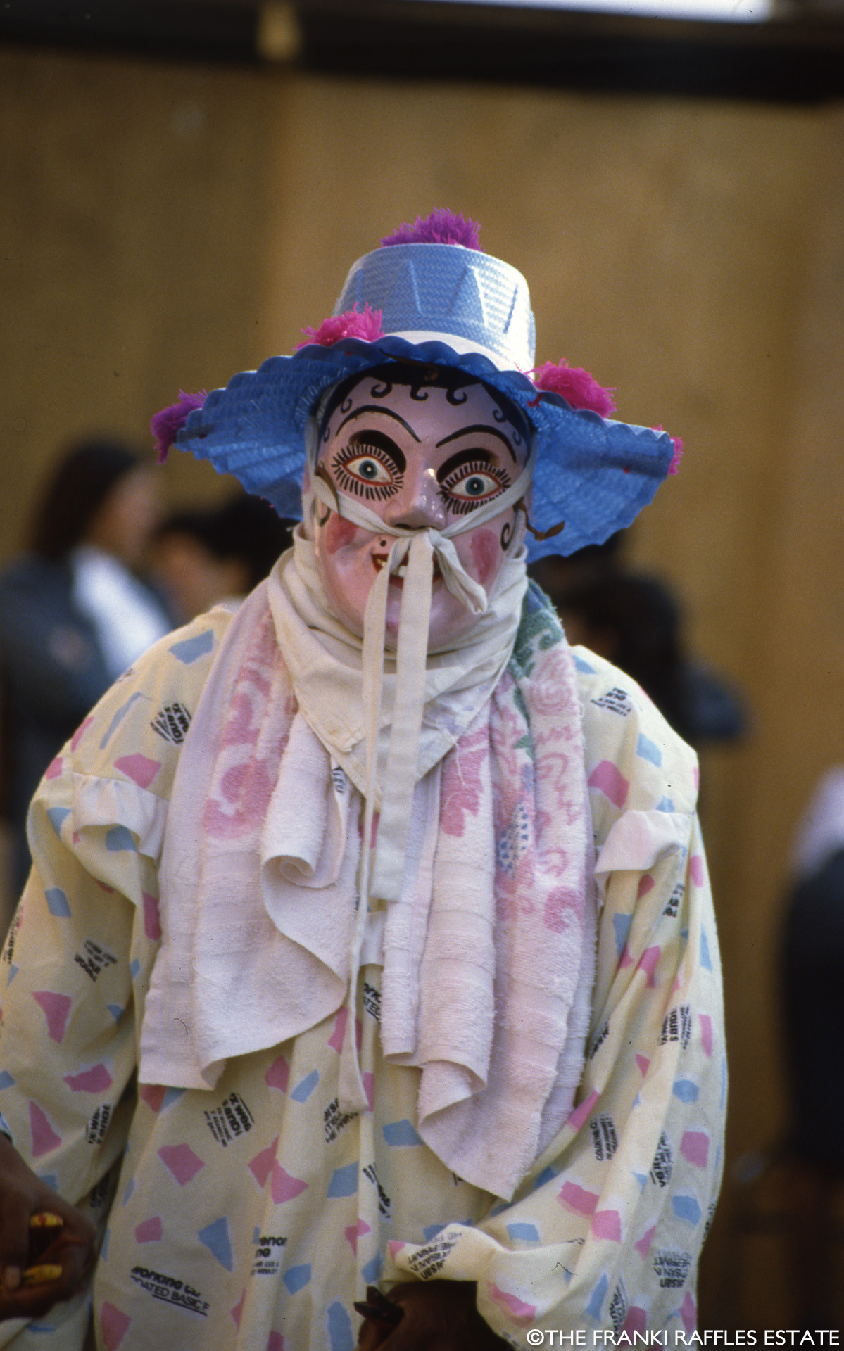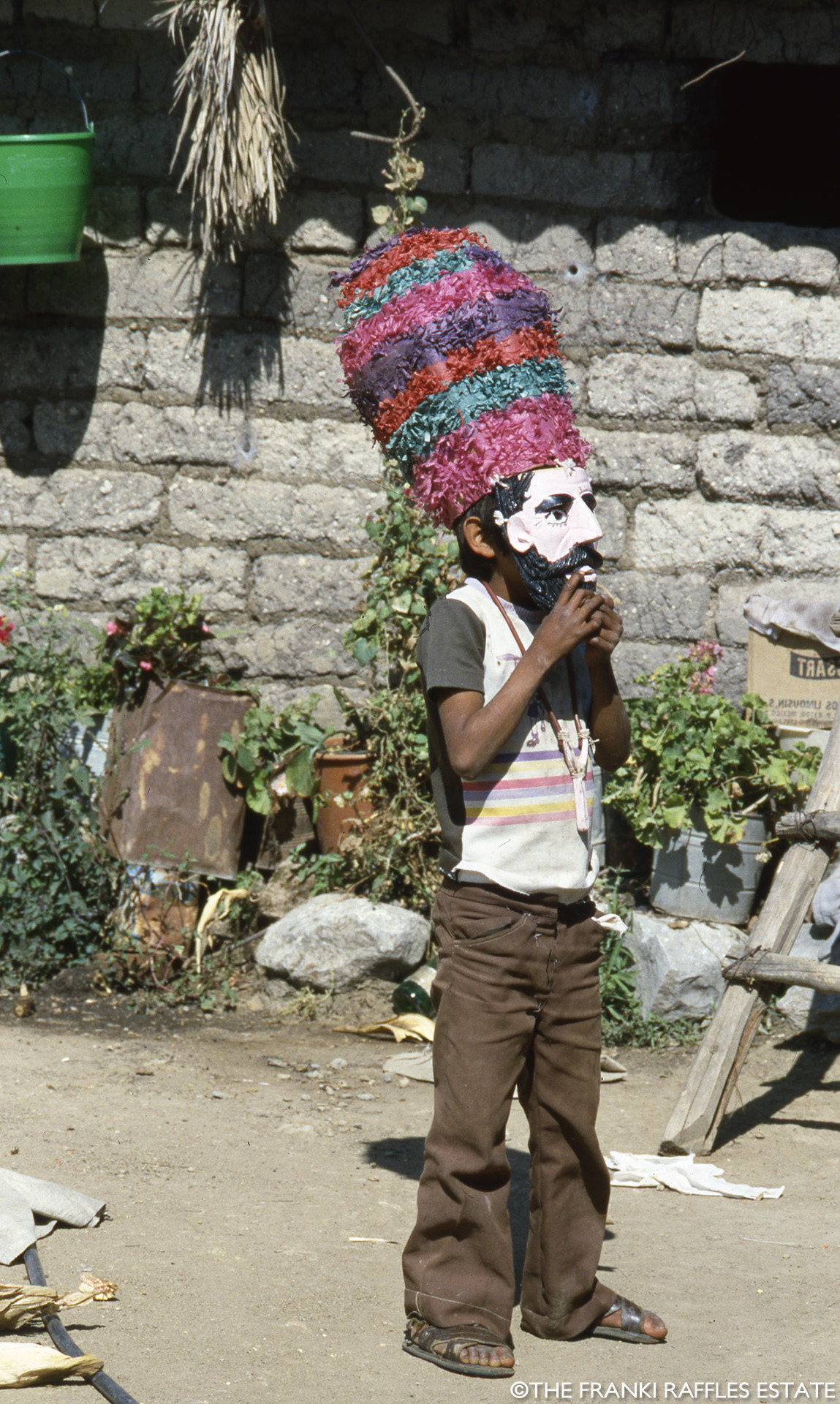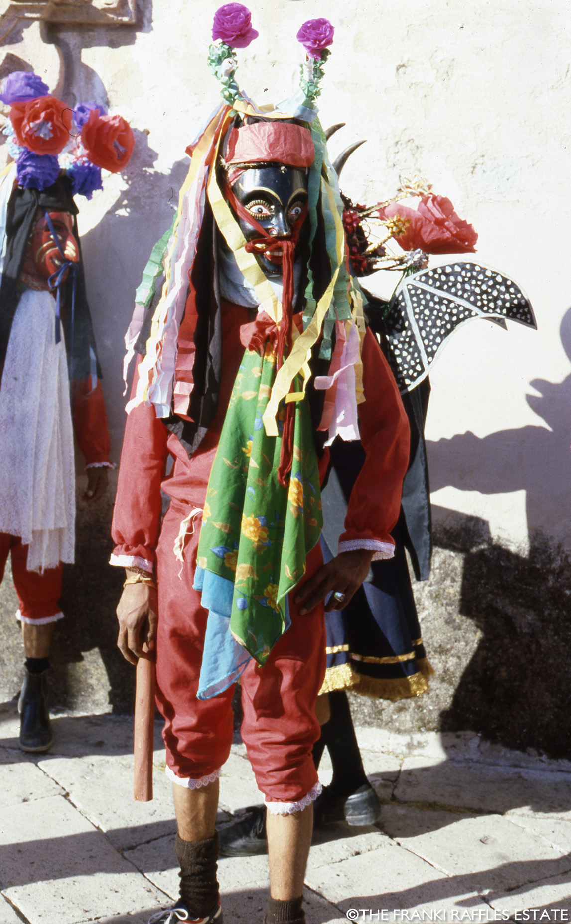 The images in this section were taken by Franki Raffles in November 1985 during a visit to the Guerrero region of Mexico. She travelled with her mother, the art dealer and curator, Gillian Raffles, to document the Guerrero dance festival, south of Mexico City. The photographs were used to contextualise and promote the exhibition Mascaras de Mexico at the Mercury Gallery, Edinburgh and London. The exhibition, together with Franki’s photographs, was reviewed by Clare Henry in The Glasgow Herald, 18 February 1986.
