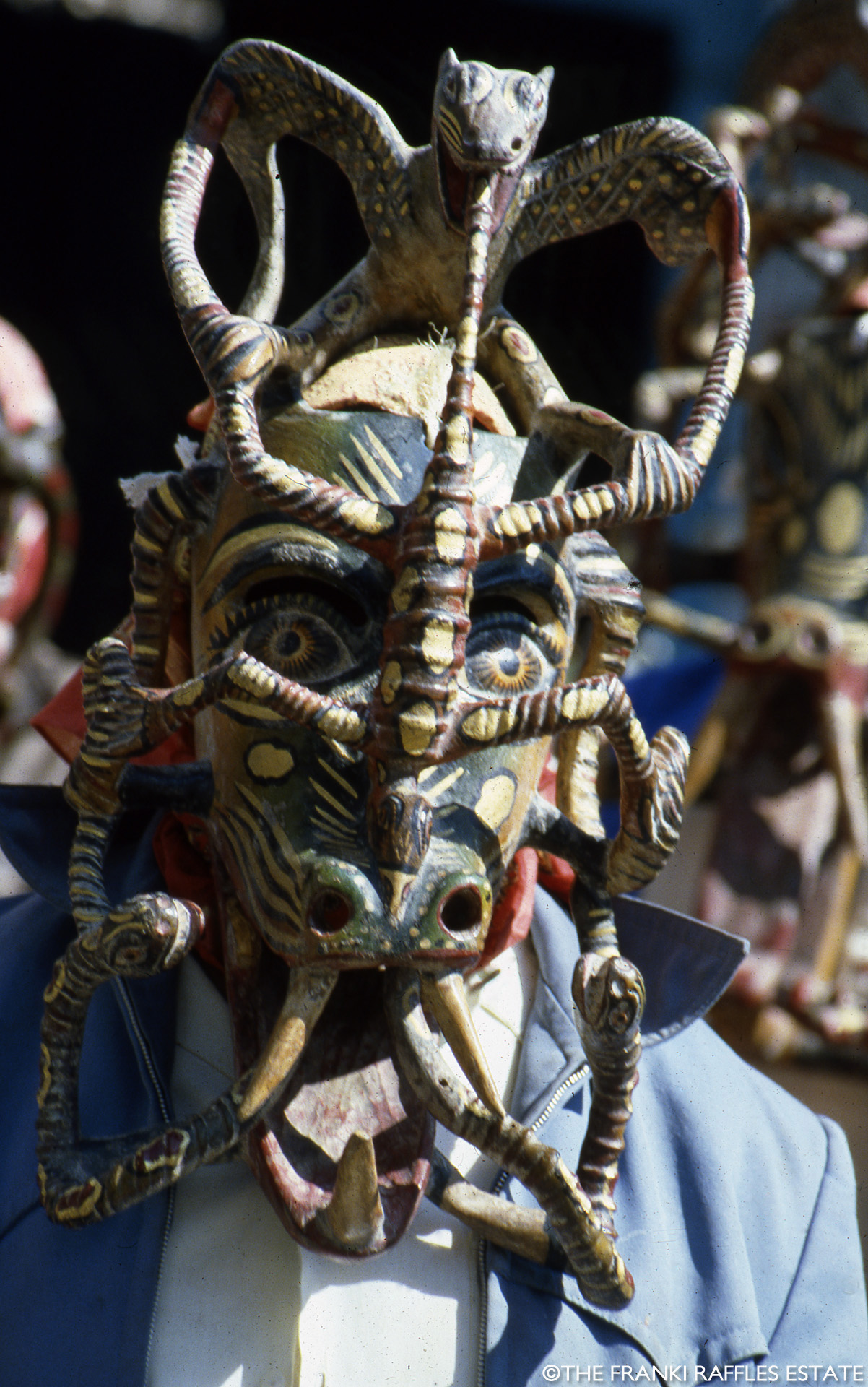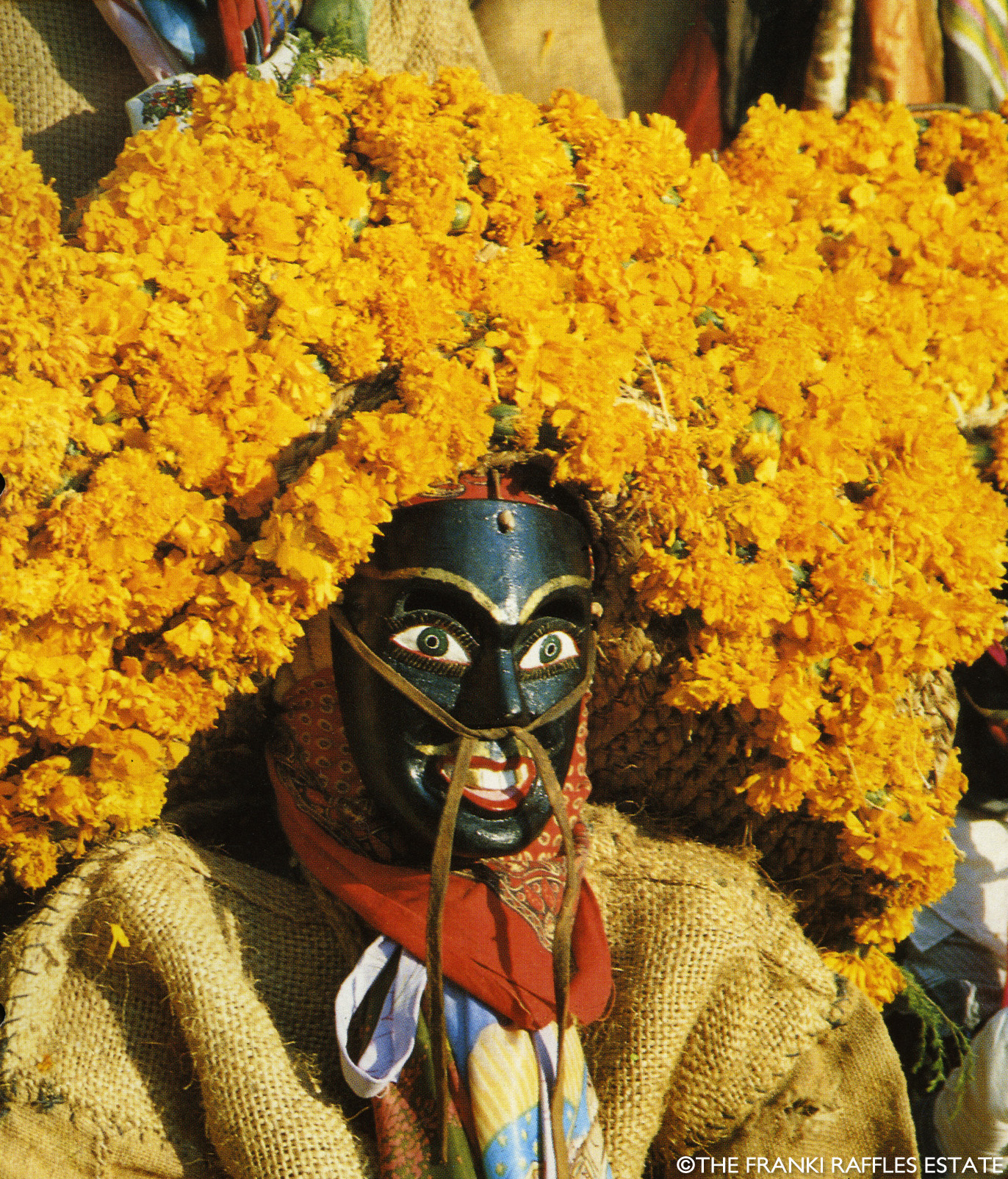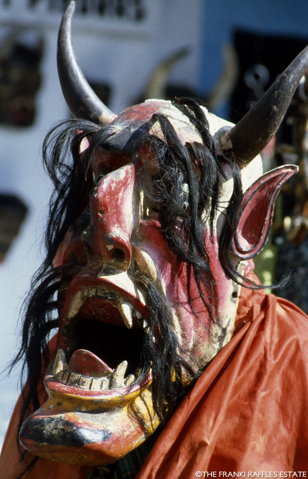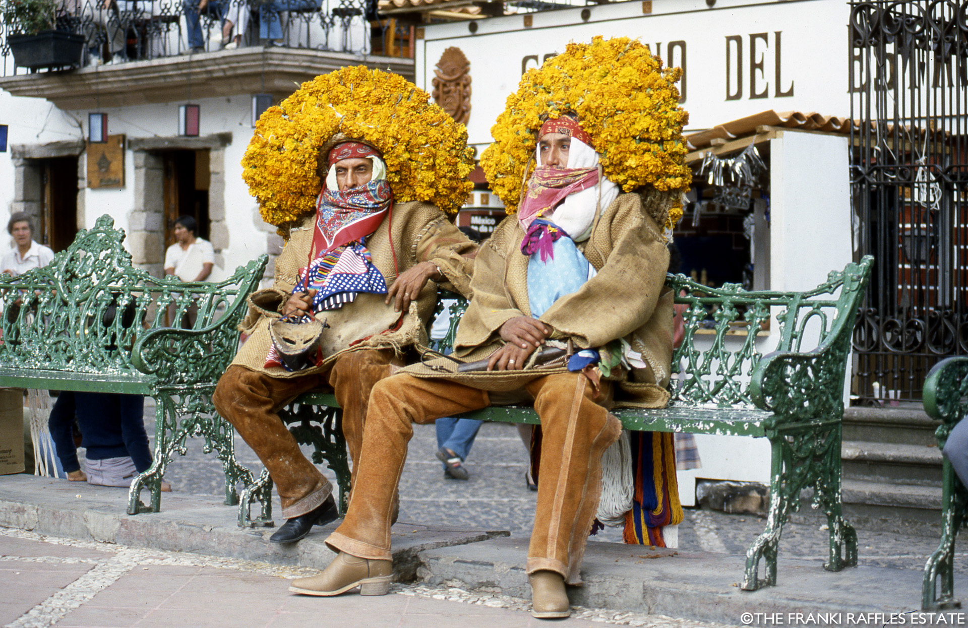 The images in this section were taken by Franki Raffles in November 1985 during a visit to the Guerrero region of Mexico. She travelled with her mother, the art dealer and curator, Gillian Raffles, to document the Guerrero dance festival, south of Mexico City. The photographs were used to contextualise and promote the exhibition Mascaras de Mexico at the Mercury Gallery, Edinburgh and London. The exhibition, together with Franki’s photographs, was reviewed by Clare Henry in The Glasgow Herald, 18 February 1986.